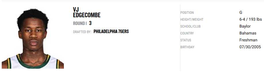 3. 76ers draft VJ Edgecombe (Baylor)