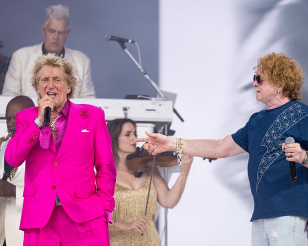 Mick Hucknall joins Stewart on the Pyramid stage at Glastonbury festival. Photograph: Harry Durrant/Getty Images