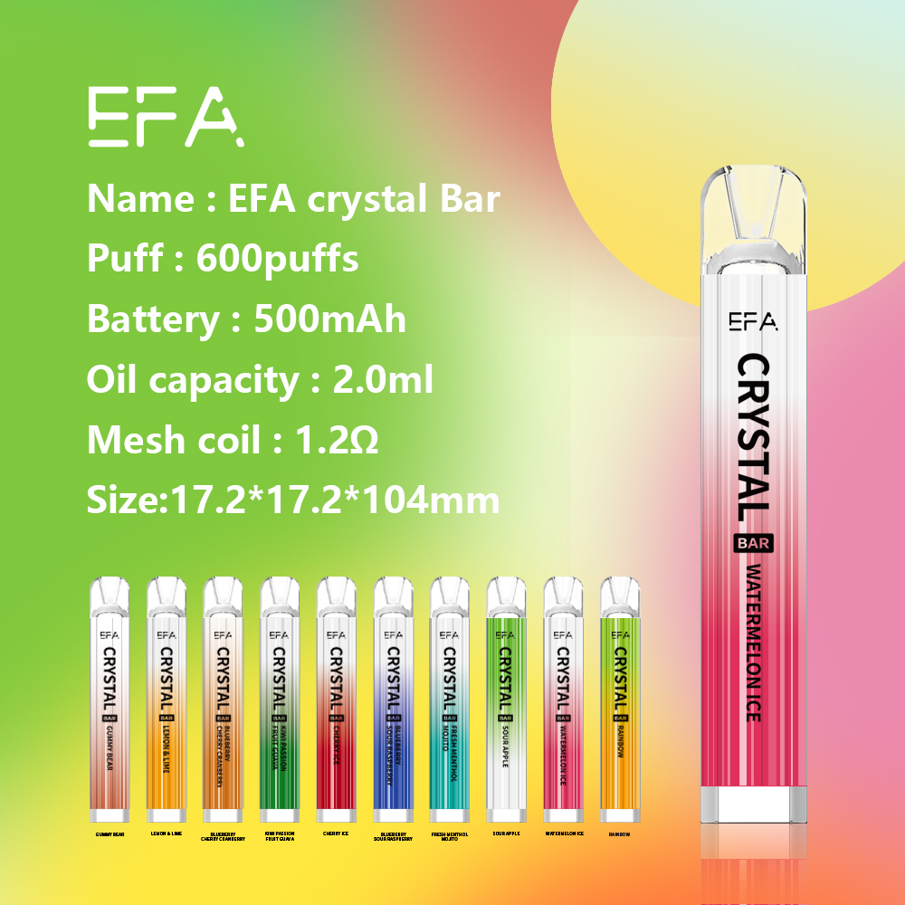 The EFA Crystal Bar 600 puffs disposable vape is the ideal choice for e-cigarette users who want a compact and convenient device without sacrificing Taste., providing up to 600 puffs, is ready to use out of the box, and boasts a wide range of delicious Tastes, delivering a simple and satisfying mouth-to-lung (MTL) experience.the EFA Crystal Bar 600 features a rechargeable 500mAh battery for longer-lasting vaping.