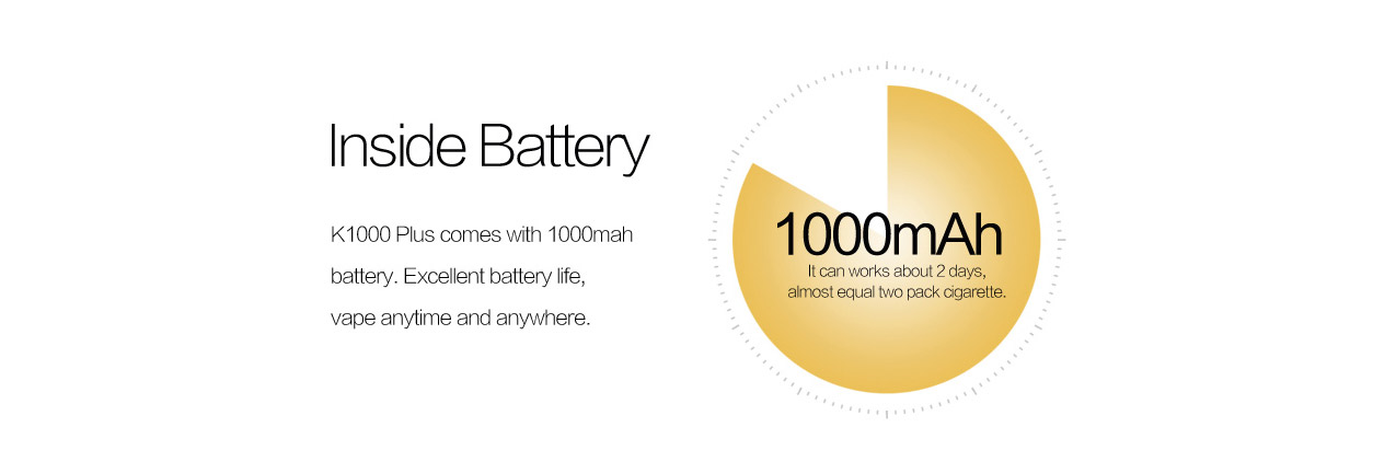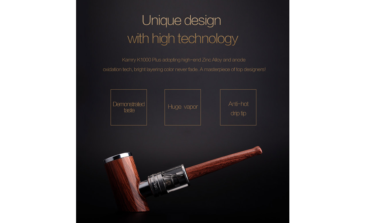 Kamry K1000 Plus is a classic ePipe kit supporting a max 30W full power output. It packs a 1000mAh built-in battery and a 4ml sub ohm atomizer. With a LED fire button