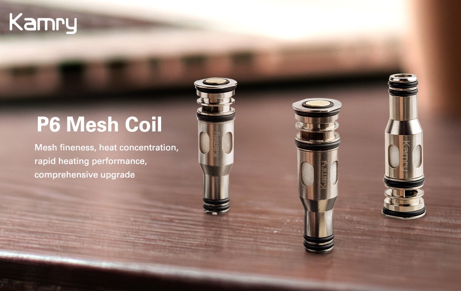 Kamry P6 Coils, Replacement Coils for Kamry P6 E-Pipe, 5-Pack Mesh Coils, for P6 E-Cigarette Kit, Coils Only (5/Pack) 0.5 ohm Mesh Coils Made from Stainless Steel and Organic Cotton. These accessory coils are for use with the Kamry P6 atomizer only; no capacity or tobacco is included. Package size: 93*44*15mm. Product weight: 23g/pack.